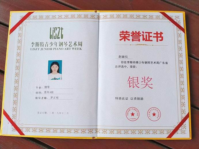 赵淑仪老师获得“李斯特青少年钢琴艺术周”广东省银奖