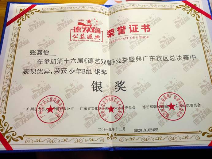 张嘉怡老师在第十六届《德艺双馨》公益盛典广东省赛区总决赛荣获少年B组钢琴银奖