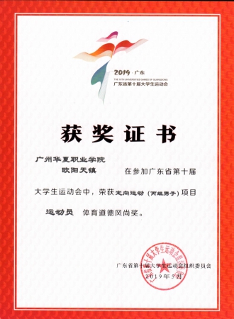 王波、齐尚尚指导:广东省大学生运动会定向运动比赛体育道德风尚奖(欧阳天镇)