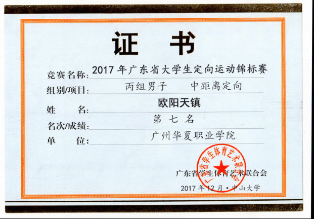 王波、宫丞飞指导:2017年广东省大学生定向运动锦标赛丙组男子中距离赛第七名欧阳天镇