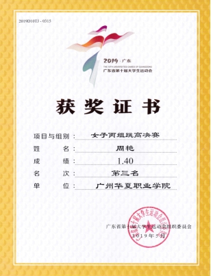 王波、宫丞飞、杨学东指导:广东省大学生运动会田径比赛女子跳高铜牌(周艳,第三名)