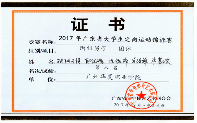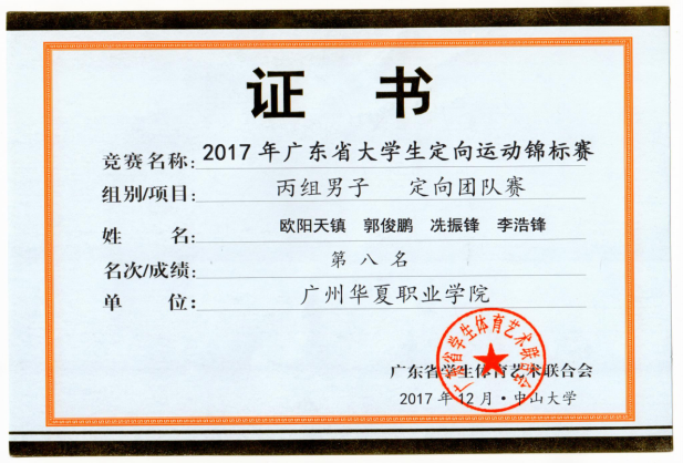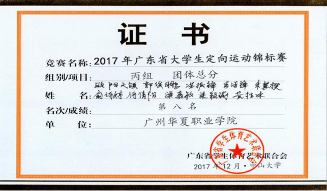 王波、宫丞飞指导:2017年广东省大学生定向运动锦标赛丙组团体总分第八名
