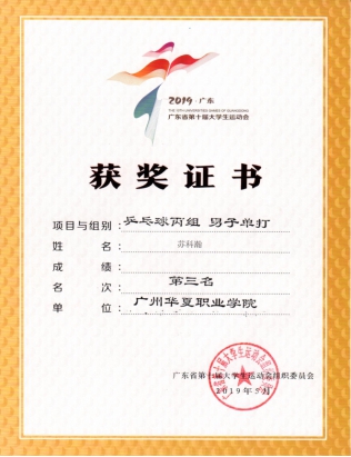 王波、齐尚尚指导:广东省大学生运动会乒乓球比赛男子单打铜牌(苏科瀚,第三名)