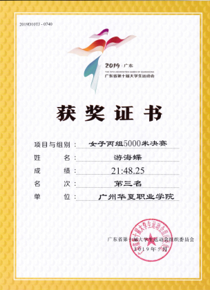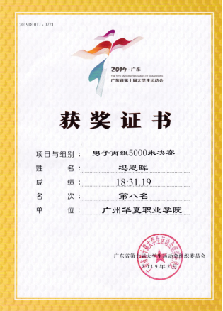 宫丞飞、杨学东、王波指导:2019年5月,第十届广东省大学生运动会田径比赛女子跳高,女子5000米第三名,男子5000米第八名