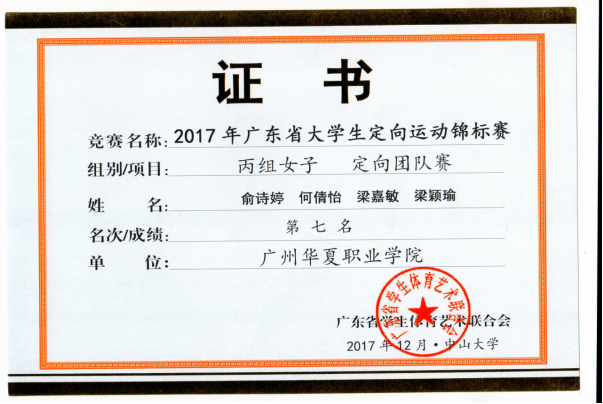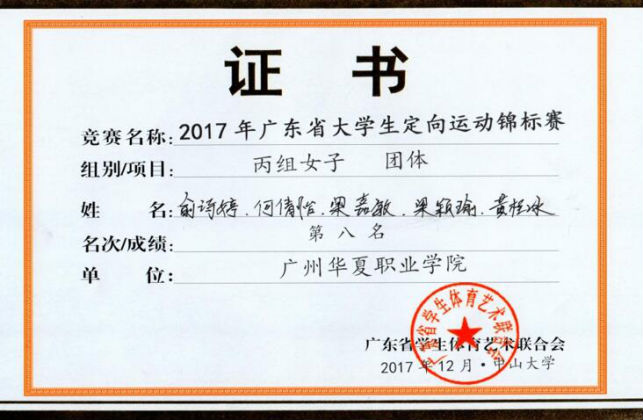 王波、齐尚尚指导:广东省大学生运动会定向运动比赛女子短距离赛第八名(梁颖瑜)
