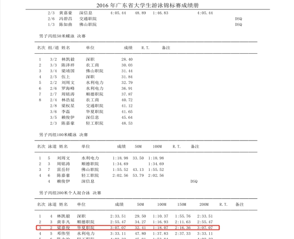 王波:2016年广东省大学生游泳锦标赛200米个人混合泳第三名(梁嘉俊)